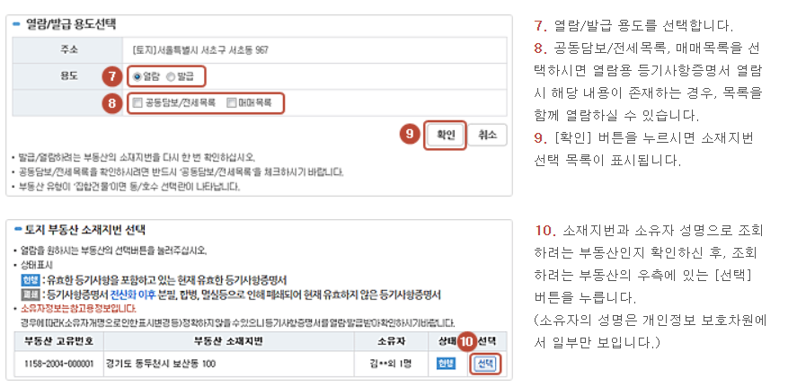 - 부동산의 매도인, 임대인의 소유권이나 저당권 등의 상태를 확인할 수 있습니다.
