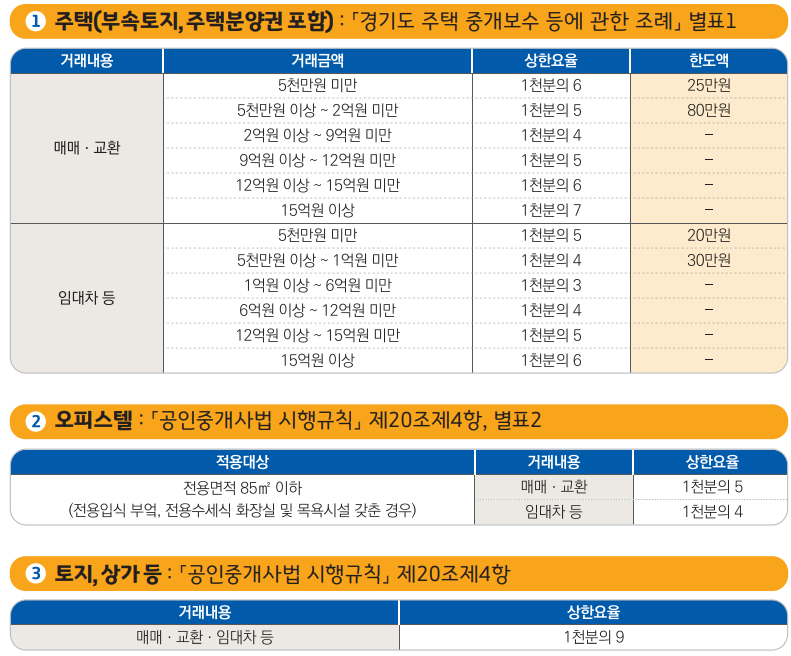 - 거래 유형(매매, 전세, 월세)에 따라 요율이 다르며, 법정 한도가 정해져 있어 이를 초과할 수 없습니다.