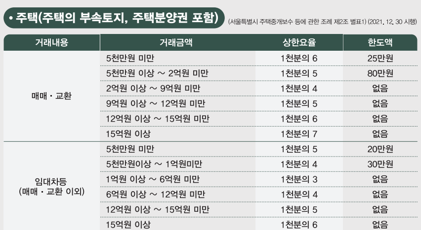 - 매매 복비의 경우 고가 주택(9억 원 이상)에서는 협의 가능 요율이 적용됩니다.