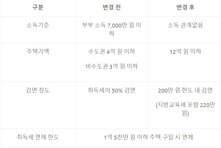 - 공시가격 1억 5천만 원 초과 ~ 3억 원 이하(수도권은 4억 원 이하): 취득세 50% 감면 감면