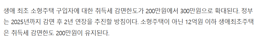 - 2024년 8월, 생애 최초 소형주택 구입자 취득세 감면한도는 300만원으로 확대되었으며, 소형주택 아닌 12억 이하 생애최초 주택은 취득세 감면한도 200만원이 유지됩니다.