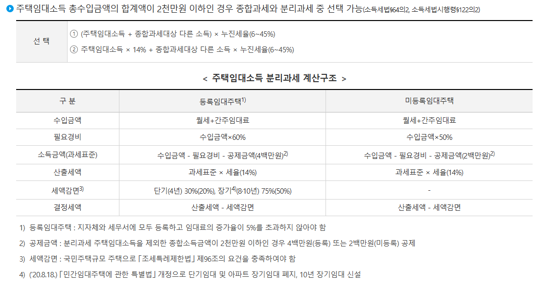 • 주택임대사업자가 분리과세로 임대소득세 신고하면 수입 1000만원까지는 세금을 내지 않아도 된다. (미등록사업자는 수입 400만원까지 세금 내지 않는다.) -> 세금을 확실히 줄일 수 있겠다.