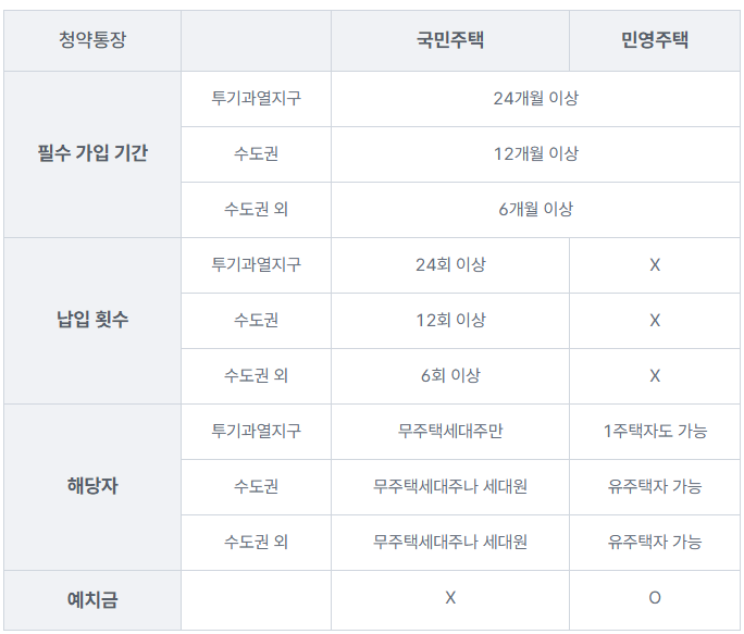 • 투기과열지구인 (강남,서초,용산,송파)는 24개월 이상 가입을 유지하고 있어야 하며, 국민주택은 무주택 세대주만 청약이 가능합니다.