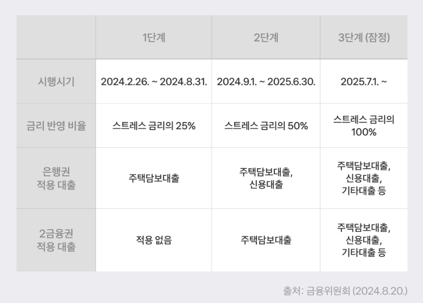 - 2단계는 2024년 9월부터 시행되고 있어요. 스트레스 금리의 50%인 0.75%p까지 가산금리가 올라갔고, 은행권 신용대출과 제2금융권 주택담보대출까지 포함되었어요.